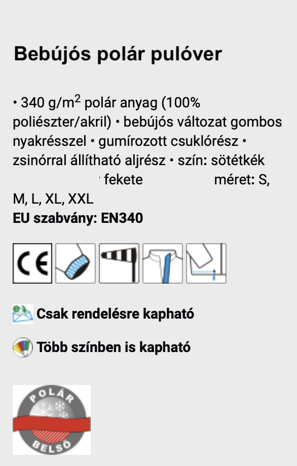 • 340 g/m2 polár anyag (100% poliészter/akril) • bebújós változat gombos nyakrésszel • gumírozott csuklórész • zsinórral állítható aljrész • szín: sötétkék, vagy fekete  • méret: S, M, L, XL, XXL