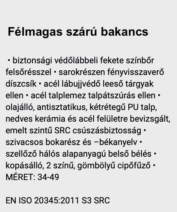 • biztonsági védőlábbeli fekete színbőr felsőrésszel • sarokrészen fényvisszaverő díszcsík • acél lábujjvédő leeső tárgyak ellen • acél talplemez talpátszúrás ellen • olajálló, antisztatikus, kétrétegű PU talp, nedves kerámia és acél felületre bevizsgált, emelt szintű SRC csúszásbiztosság • szivacsos bokarész és –békanyelv • szellőző hálós alapanyagú belső bélés • kopásálló, 2 színű, gömbölyű cipőfűző • MÉRET: 34-49